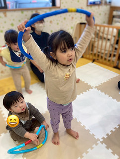 ボールを使った運動や、丸くしたホースを使った引っ張り合いっこ!!