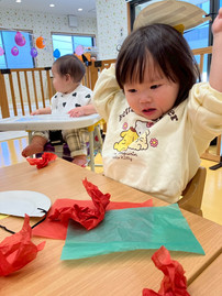 昨日は大きい赤鬼さんが保育園にやってきました。来る前にお面の製作をして、鬼さんの顔が貼ってある風船に向かってカラーボールを投げて、鬼さん退治の練習をしていました! ところが練習と違って本物がやってくると、みんな一目散に保育者の後ろや、お部屋の隅っこに! 優しい鬼さんだったのですけどね😊