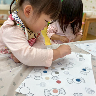 シール貼りをしてお絵描き🖍とってもおいしそうなキャンデイが出来ましたよ🍬
